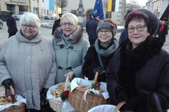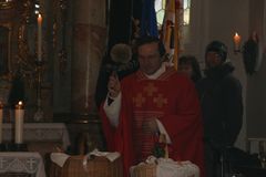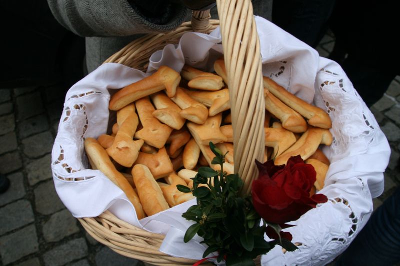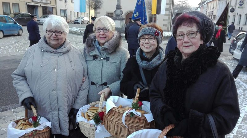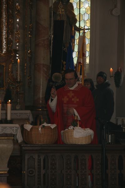 Am Ende des Gottesdienstes segnete Pfarrer Müller die Sebastianspfeile, die in diesem Jahr wieder von Frauen der Kolpingsfamilie unter der Anleitung von Christian Flor gebacken wurden. Zusammen mit Tee ließen sich die Gottesdienstbesucher die Pfeile anschließend an der Pestsäule schmecken.