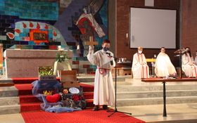 Vor dem Kirchenportal warteten auf ihn bereits Kinder der…